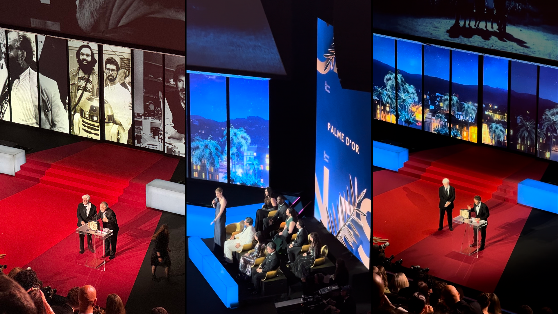 Left to right: 1. Francis Ford Coppola giving George Lucas an honorary award; 2. Greta Gerwig announcing this year’s Palme d’Or, Anora; 3. Sean Baker, who dedicated his award “to all sex workers past, present, and future.” Photo Credit: Stephen David Miller