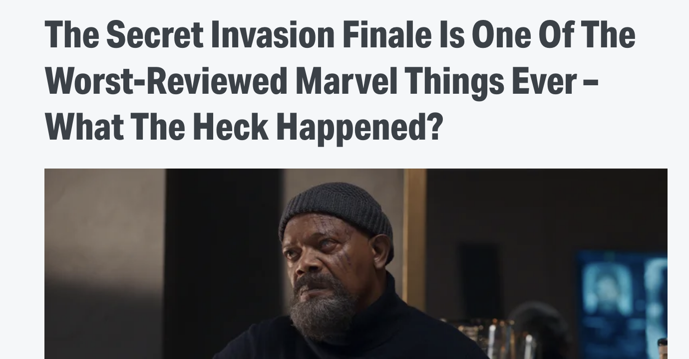 It turns out that Marvel’s Secret Invasion, which just wrapped up a six-episode run on Disney+, is the worst-reviewed piece of content that has ever come out of Marvel. It currently sport a Rotten Tomatoes score of 8% (albeit only with 12 reviews). It was also recently revealed that Secret Invasion’s budget was $212 million. How did we get here?