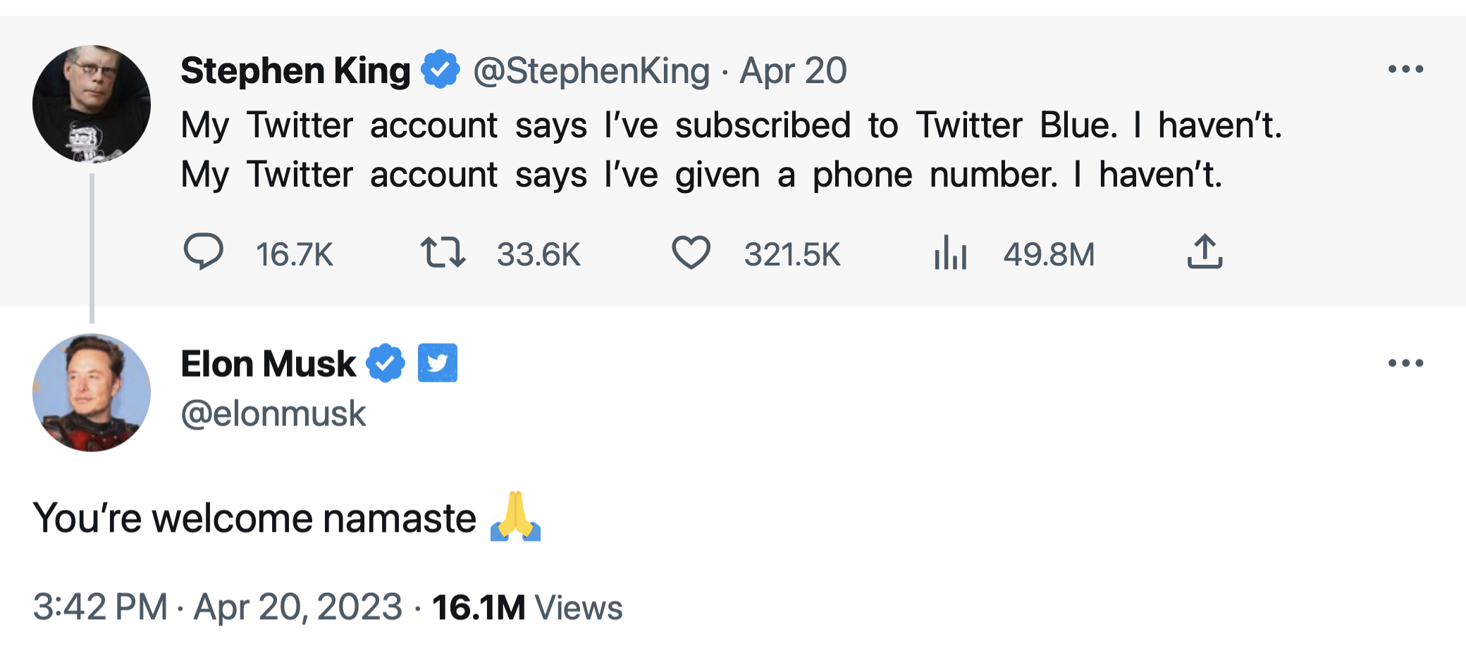 Small wonder that people like LeBron James and Steven King did not wish to pay for Twitter Blue. That was when Elon Musk admitted he was paying for those specific users’ Twitter Blue subscription personally. Always a great sign when you need to own your critics by…paying for the service that they despise and that you have to give away via coercion?