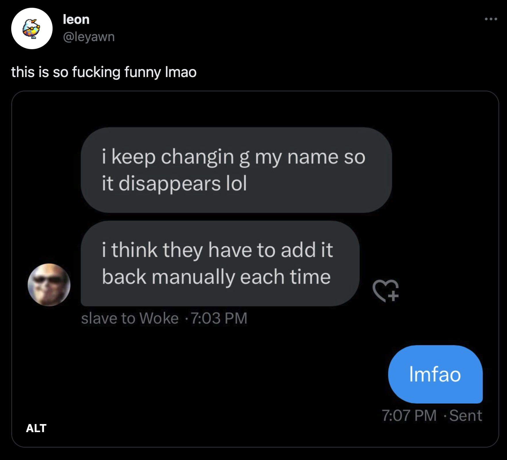 [On a lighter note. There also seems to be a delightful drama unfolding on the side with @dril, one of the greatest Twitter users of all time, trying to evade a verification badge. It turns out that when you change your profile display name, your verification goes away (a precautionary measure intended to prevent impersonation). As a result, he’s been changing his display name over and over, only to keep getting it put back on. The idea of Musk, one of the richest men in the world, hovering over someone’s computer and waiting for dril to change his username so they can put the blue check back on is a mental image that would be objectively hilarious if it wasn’t so very sad.]