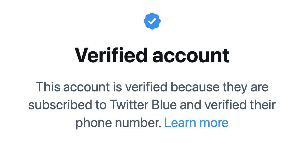 - It changed its verification text (the text that appears when you hover over the blue check) to read “This account is verified because they are subscribed to Twitter Blue and verified their phone number.” A reasonable claim to make, if true.
